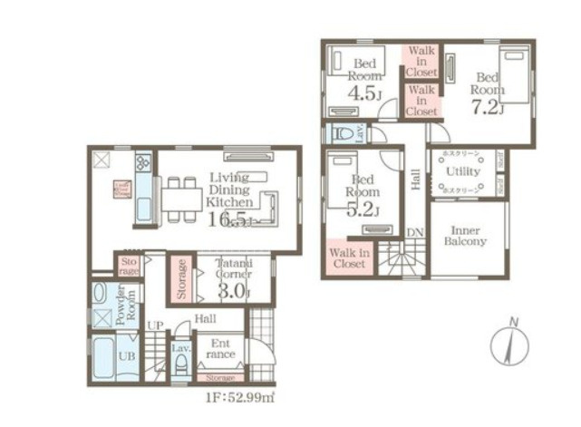 3LDK+3WIC+畳コーナー3帖の間取りです、駐車スペース3台可!